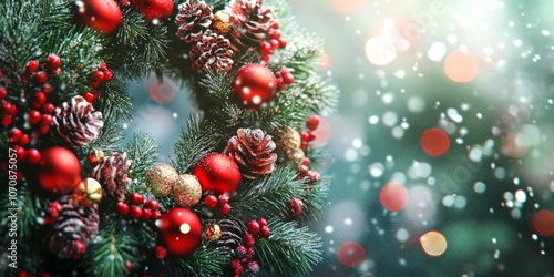 A vibrant Christmas wreath adorned with red ornaments and pine cones. It captures the holiday spirit beautifully. Perfect for festive decorations or seasonal celebrations. AI