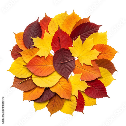 A vibrant circular arrangement of assorted autumn leaves in shades of red, orange, and yellow, isolated on transparent background