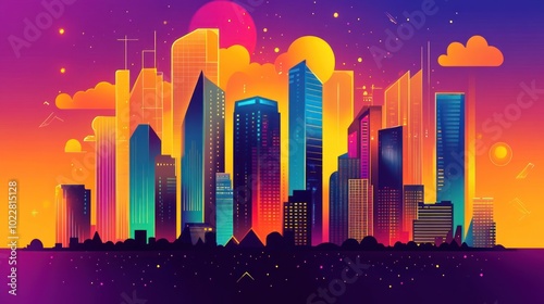 city, skyline, sunset, building, colourful, graphic, urban, design, architecture, light, modern, landscape, digital, art, night, illustration, silhouette, vibrant, scenery, sun, cloud, geometry, abstract, technology, culture, creativity, aesthetic, dusk, horizon, metropolis, reflections, shape, atmosphere, gradient, visual, scene, fantasy, colours, beauty, environment, structure, space, view, perspective, line, pattern
