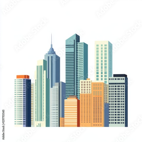 A vibrant city skyline featuring a mix of modern and classic architecture in various hues.