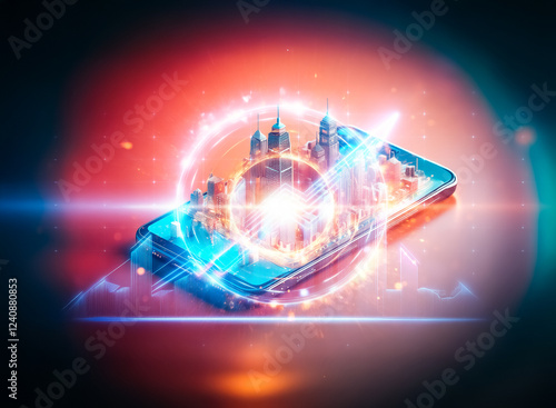 A vibrant cityscape miniature sits atop a sleek smartphone, illuminated with warm and cool tones. This digital rendering showcases the concept of mobile urban connectivity.