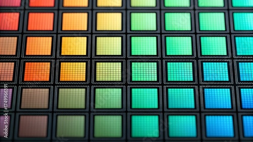 A vibrant closeup showcases a grid of colorful squares, each a unique hue ranging from warm oranges and yellows to cool greens and blues, creating a mesmerizing mosaic of color and texture