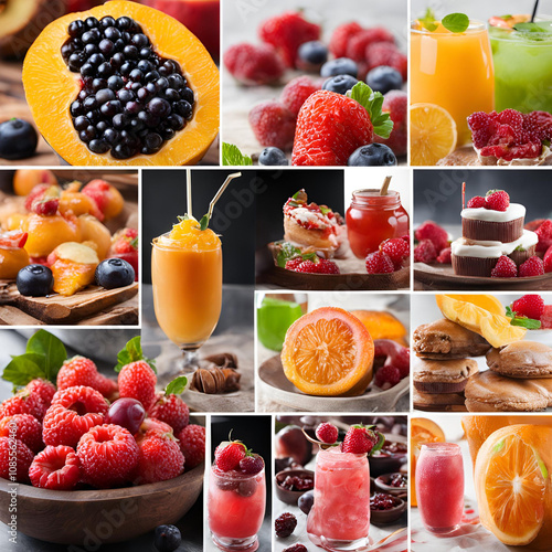A vibrant collage of fresh fruits, juices, desserts, and smoothies featuring berries, oranges, and tropical ingredients, perfect for healthy lifestyle inspirations.