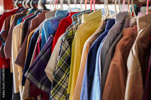 shirt, clothing, fashion, apparel, hanger, retail, clothes rack, style, colourful, variety, collection, fabric, pattern, design, garment, textile, wear, dress, casual attire, formal, shop, boutique, store, market, commerce, business, trade, economy, industry, stack, choice, display, arrangement, row, line, linen, cotton, plaid, striped, chequered, sleeve, textural, domestic, indoor