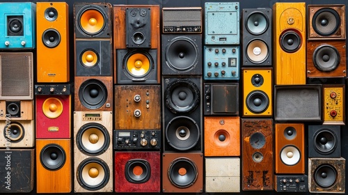 speaker, vintage, collection, colourful, display, audio, equipment, design, retro, music, sound, wall, arrangement, home, decor, technology, style, aesthetic, craftsmanship, heritage, nostalgia, artistic, vibrant, unique, classic, wooden, metal, circular, square, panel, texture, pattern, harmony, visual, eclectic, variety, bold, bright, detail, ambience, atmosphere, composition