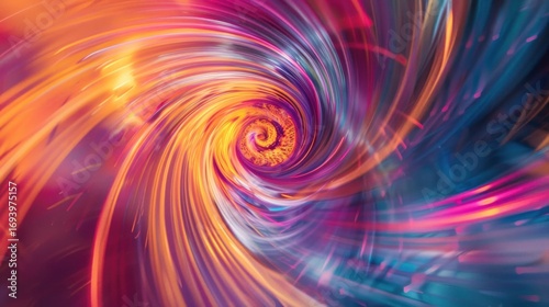 A vibrant, colorful abstract swirl of colors and shapes, with a mix of warm and cool tones, set against a gradient background.