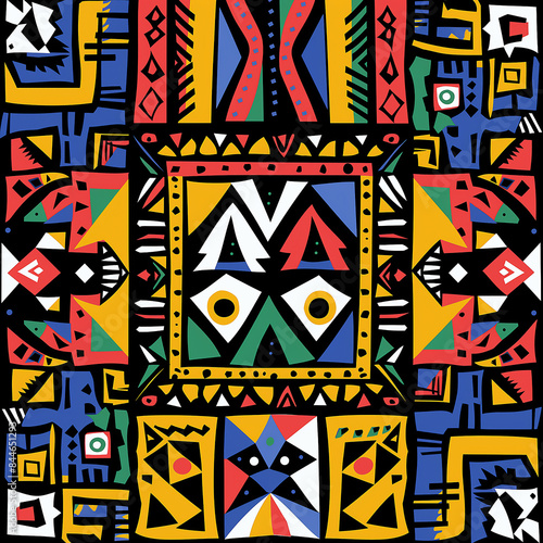 A vibrant, colorful tribal pattern with geometric shapes and intricate patterns in the style of African art. The design includes bold colors like reds, blues, yellows and greens