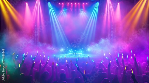 A vibrant concert scene with colorful lights and an engaged audience waving glow sticks.