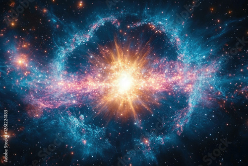 A vibrant cosmic explosion, showcasing a brilliant burst of energy and celestial colors within a nebula.