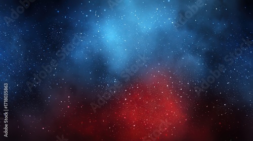 A vibrant cosmic scene with blue and red nebula clouds and scattered white stars against a dark space background