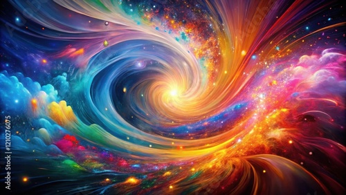 A vibrant cosmic swirl of color and light, depicting a dynamic nebula with swirling galaxies and celestial energy