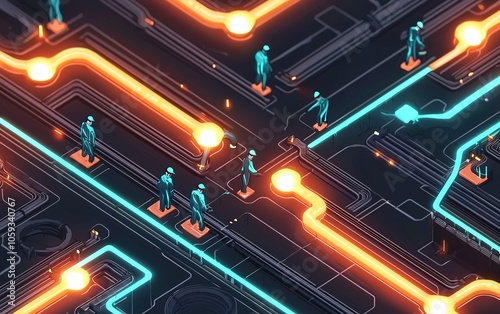 digital, art, futuristic, circuit, board, neon, light, technology, virtual, reality, navigation, glowing, pathway, landscape, stylised, figure, night, scene, abstract, artificial, intelligence, cyber, space, illuminated, geometric, design, electronic, modern, vibrant, colours, labyrinth, people, computer, graphic, rendering, urban, tech, theme, simulation, imaginative, inventiveness, creative, aglow, networking, visual, multimedia, concept, aesthetic, innovation