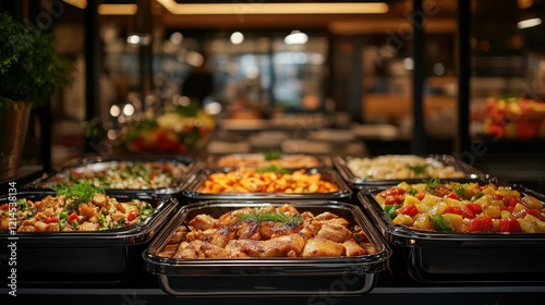 A vibrant display of various delicious dishes in black containers, showcasing a variety of colorful salads, fruits, and entrees in a modern dining setting.