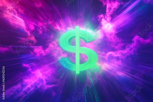 A vibrant dollar sign graphic against a backdrop of dynamic light streaks.