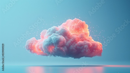 A vibrant, fluffy cloud illuminated with pink and blue hues, floating against a serene sky background with a reflective surface below. 3D Illustration.