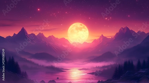 moon, night, mountain, river, star, sky, landscape, sunset, dusk, dawn, tree, forest, nature, water, purple, pink, orange, light, glow, horizon, peak, vale, cloud, mist, fog, atmosphere, celestial, wilderness, scenic, peaceful, beautiful, tranquil, aethereal, illuminated, gradient, distant, huge, depth, colours, illustration, background, serene, artistic, luminescent, aesthetic