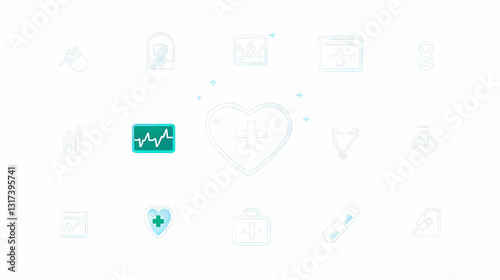 A Vibrant Heart Representing Holistic Healthcare Surrounded By Various Medical Icons In A Minimalist, Light Teal And White Design