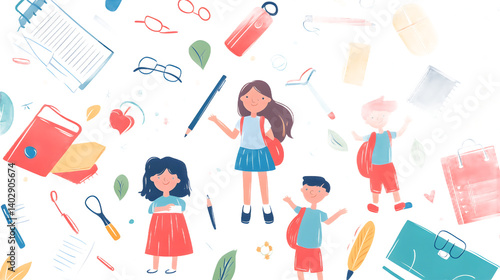children, illustration, school supplies, education, playful, diverse, happy, colourful, back to school, friendship, learning, fun, creativity, childhood, art, environment, notebook, vibrant, young, nature, expression, joyful, play