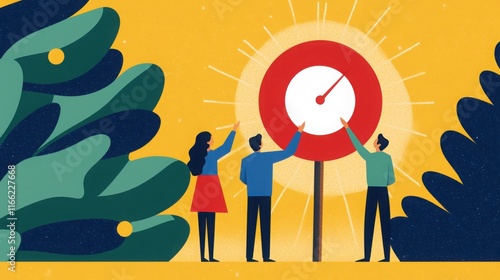 A vibrant illustration showing three individuals adjusting a gauge or meter against a sunny backdrop, surrounded by stylized greenery.