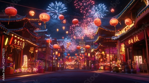 A vibrant interactive Chinese New Year scene, where users can click to trigger fireworks, lanterns, and lucky symbols on a festive street