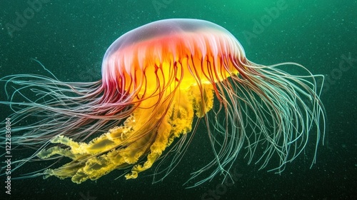 jellyfish, ocean, water, sea, marin, life, animal, aquatic, invertebrate, medusa, tentacle, bell, body, colours, vibrant, red, orange, yellow, pink, gold, hue, shades, tone, glow, light, dark, green, background, deep, underwater, beauty, nature, wildlife, creature, organism, spectacular, stunning, mesmerizing, magnificent, aethereal, graceful, elegant
