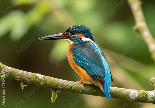 A vibrant kingfisher bird with striking blue and orange plumage perched on a mosscovered tree branch in a natural forest setting