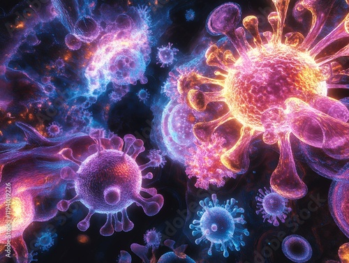 A vibrant microscopic image depicting viruses in vivid colors. A scientific representation of viral structures.