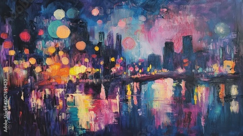 A vibrant oil painting depicting a city skyline at night with colorful lights reflecting on the water.
