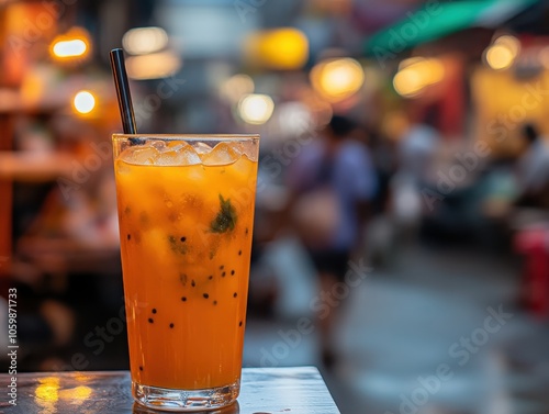 A vibrant orange thai iced tea in a clear glass with a refreshing twist of flavor and colorful presentation