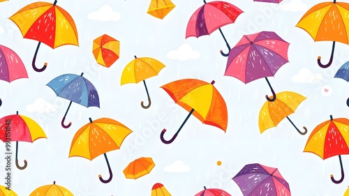 A vibrant pattern featuring various umbrellas against a light blue background, bringing a cheerful touch to rainy days.