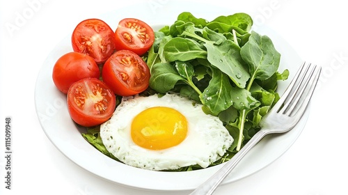 A vibrant plate featuring a sunny-side-up egg, fresh tomatoes, and leafy greens, showcasing a healthy and appetizing meal.