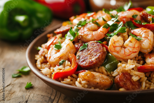 A Vibrant Plate Of Creole Jambalaya Food Dish With Shrimp, Sausage, And Colorful Bell Peppers, Garnished With Parsley And Served In A Rustic Bowl, Capturing The Dish's Rich Textures.