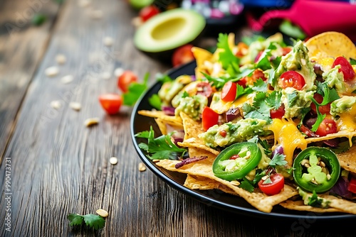 A vibrant plate of loaded nachos with melted cheese, jalapeños, and guacamole