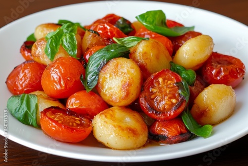 A vibrant plate of ricotta gnocchi tossed with roasted cherry tomatoes and fresh basil, served on a white plate