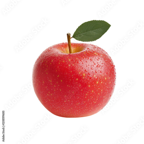 A vibrant red apple with a fresh green leaf, adorned with droplets of water, showcasing its crisp and juicy appearance.
