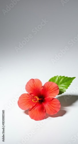 A vibrant red hibiscus bloom featuring a healthy green leaf, perfectly isolated on a bright white background ,pink, decoration, tropical