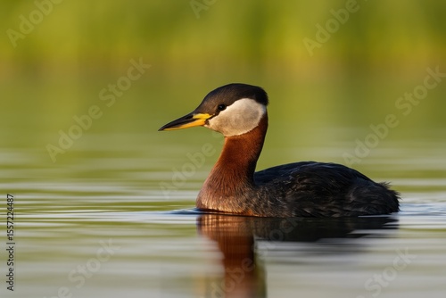 A vibrant red-necked grebe glides peacefully across a tranquil lake surface.