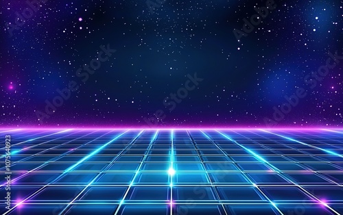 retro, futuristic, landscape, grid, star, night, digital, colours, neon, blue, vibrant, cosmic, bright, horizon, fantasy, space, vision, technology, nostalgia, atmosphere, 80s, art, design, light, illumination, background, pattern, wave, creative, abstract, beauty, dreamlike, cyber, universe, reflections, geometric, surreal