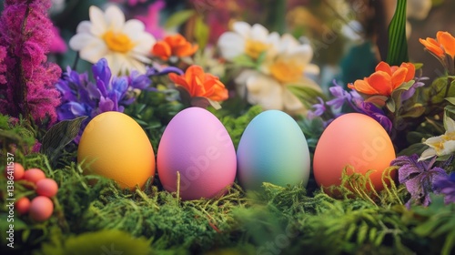 A vibrant spring scene featuring four beautifully decorated eggs in pastel colors, nestled among an array of flowers and lush greenery. The eggs are positioned on a bed of moss, surrounded by a mix of