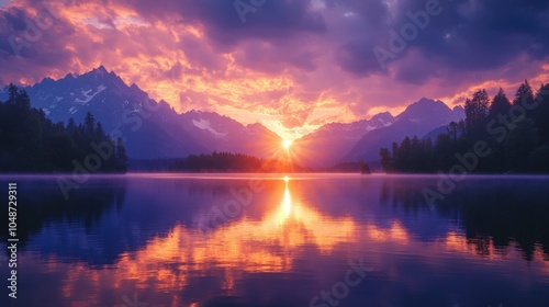 A vibrant sunset casts a warm glow over a tranquil mountain lake with a reflection of the mountains and the sun.