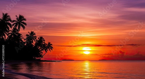 A vibrant sunset over a tropical beach with palm trees silhouetted against the sky.