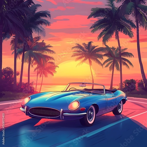 A vibrant sunset scene featuring a vintage convertible car driving along a coastal road lined with palm trees.