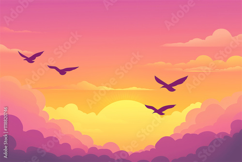 A vibrant sunset with silhouettes of birds flying across the colorful sky. The image evokes freedom, tranquility, and natural beauty.