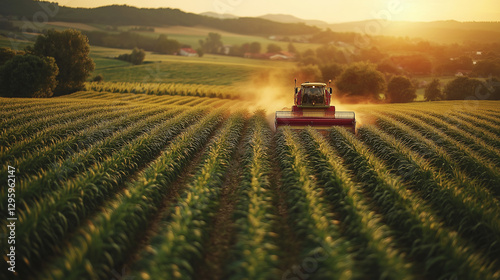 A vibrant tractor moves through expansive rows of crops, dust rising into the warm evening air as the sun casts a golden glow over the lush fields, symbolizing the hard work of farming