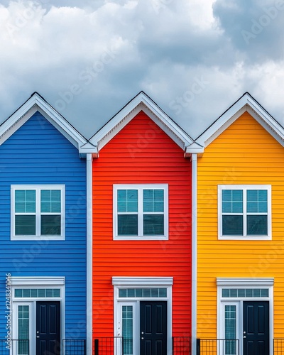 A vibrant trio of houses featuring blue, red, and yellow exteriors under a cloudy sky, showcasing modern architecture and colorful design.