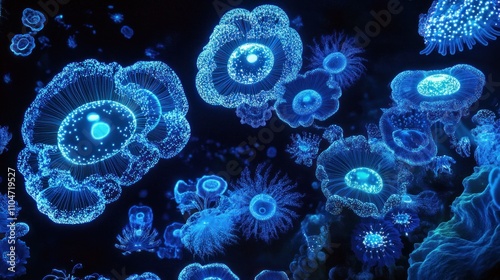 jellyfish, ocean, marin, glowing, bioluminescence, aquatic, creature, underwater, nature, blue, aethereal, environment, life, ecosystem, biodiversity, sea, water, fauna, surreal, semitransparent, organism, habitat, deep, current, beauty, calmness, science, exploration, coral, wave, species, illumination, pattern, fluid, movement, symmetry, delicate, colourful, reflections, depth, surrealism, wonder, discovery, oceanography