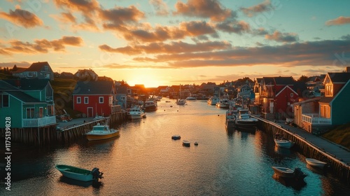 A vibrant waterfront featuring a canal surrounded by colorful houses and small boats under a golden sunset