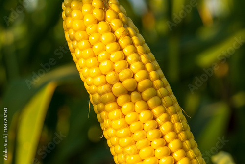 A vibrant yellow corn cob, filled with plump kernels, grows on a farm with green leaves in the background. The sunlight illuminates the corn