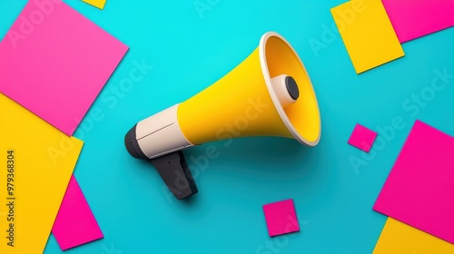 A vibrant yellow megaphone surrounded by colorful geometric shapes on a turquoise background, symbolizing communication and promotion.
