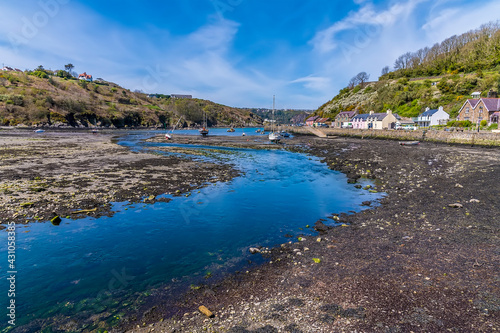 A view along the River Gwaun a low tide in the harbour at Lower Fishguard, South Wales on a sunny day